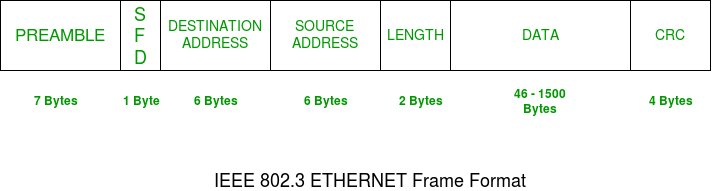 Both IP header and data will be inserted here if Internet Protocol is used over Ethernet. The maximum data present may be as long as 1500 Bytes. In case data length is less than minimum length i.e. 46 bytes, then padding 0’s is added to meet the minimum possible length.
